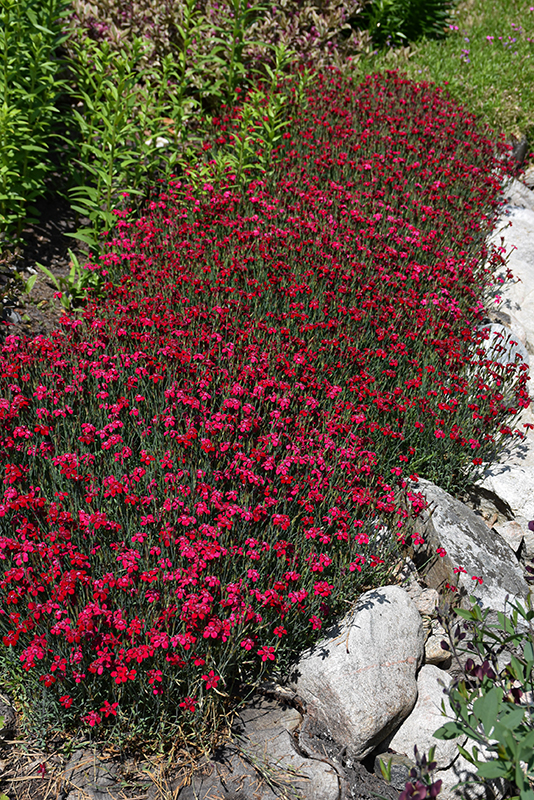 Flashing Light Maiden Pinks has masses of beautiful fragrant crimson frilly flowers with a dark red ring at the ends of the stems from late spring to mid summer, which are most effective when planted in groupings. The flowers are excellent for cutting. Its attractive narrow leaves remain dark green in color throughout the year.