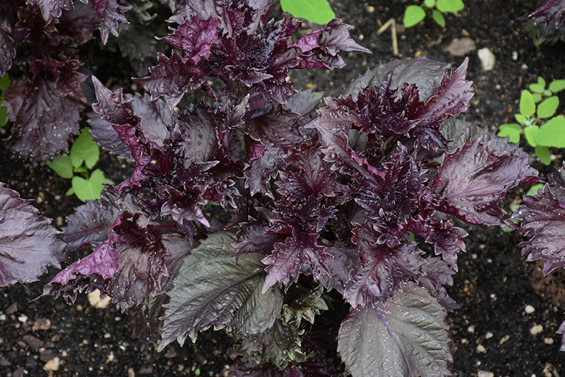 Dark red-purple leaves with burgundy veins on a dense bushy plant; a great garden accent or landscape plant that also works well in mixed containers; edible sprouts are used for flavoring food; performs well in sun or shade